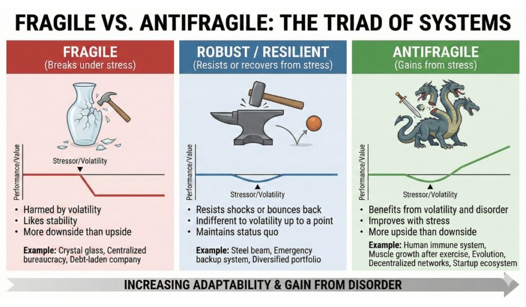 Note that being antifragile isn’t quite the same as being robust or resilient. Robustness is about withstanding external shocks and staying the same. The antifragile actually becomes better.